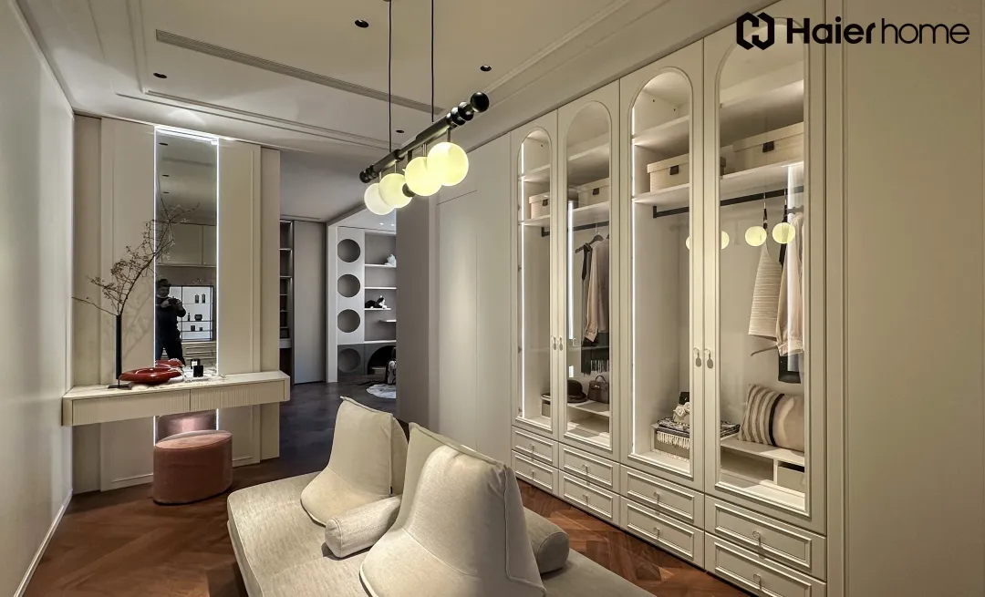 • 小法式浪漫衣帽间:特邀法国装饰艺术博物馆顾问参与指导,C型线条拼出巴洛克宫廷美学,拱形门设计拉伸层高,烤漆/PVC双材质可选,馥芮白配色+虚实结合设计,让浪漫与实用并存。