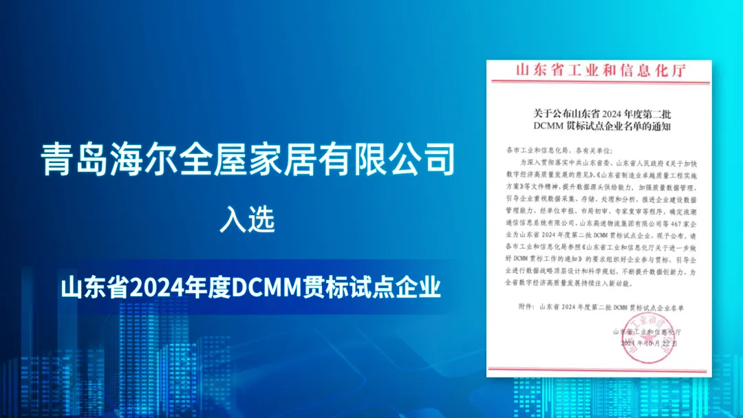 近日,省工业和信息化厅公布了山东省2024年度第二批DCMM贯标试点企业名单,经专家评审海尔全屋家居成功入选。